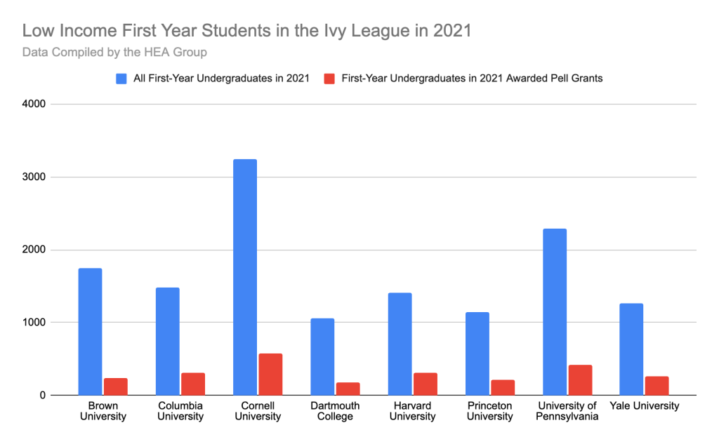 According to data compiled by the HEA Group, a higher education research agency, 18.5% of Ivy League students in the Class of 2021 received federal Pell grants (which reflects lower-income status). Compared to a 40% recipient rate for all college students across the nation, these numbers are insufficient.