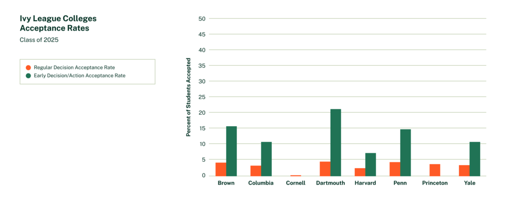 | Ivy League Colleges | Overall Accept. Rate | Regular Decision Accept. Rate | Regular Decision Apps Accepted | Regular Decision Apps Received | Early Decision / Action Accept. Rate | % of Class Filled by Early Apps | Early Decision / Action Apps Rcvd | Early Decision / Action Apps Accepted | Expected Number of Students to Enroll | Total Apps Received | Total Apps Accepted |