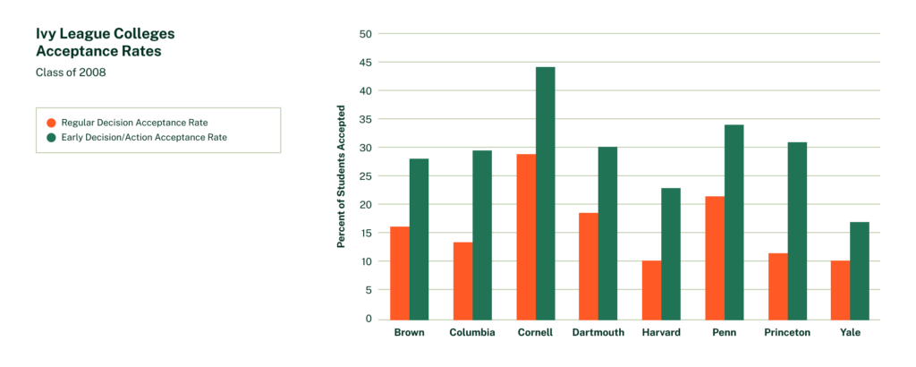 The graph below of the 2008 Ivy League admissions statistics shows a comparison between the Early Decision / Early Action acceptance rates and the Regular Decision acceptance rates: