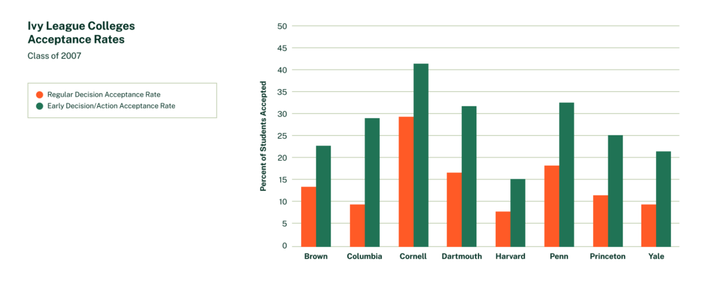 The graph below of the 2007 Ivy League admissions statistics shows a comparison between the Early Decision / Early Action acceptance rates and the Regular Decision acceptance rates: