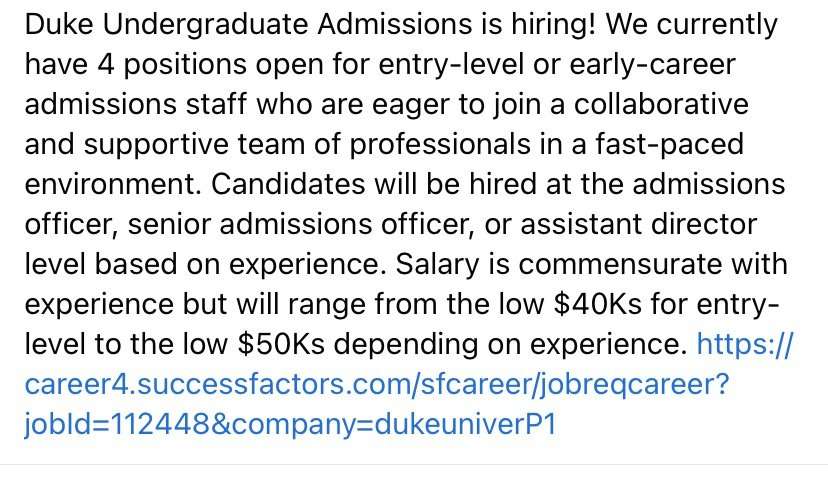 And while it may seem obvious that students should not flaunt privilege in their applications, too many students (and their parents) who are aware they shouldn’t do so do so anyway. We suppose they don’t even recognize the extent of some of their privilege. Not everyone, as an example, gets to drive their own car to school. Some students bike, others walk, or even take the school bus. So even that subtle reference in an essay about driving to school, well, it can significantly undermine one’s candidacy — and too many students and parents don’t even realize it. But we want you to understand why, in simple and unequivocal terms. We want you to understand why the smell of privilege can so significantly hurt a student’s case for admission to elite universities. To understand it, look no further than the reader. Look no further than the person who will be evaluating your case for admission. Below is an entry-level jobs posting in the Duke University admissions office. Notice anything?